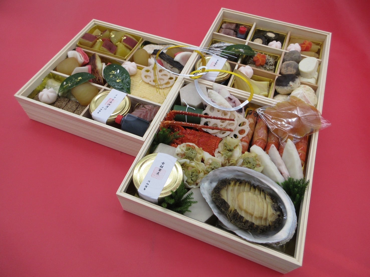 伊勢海老しゅうまい・車海老艶煮・敦賀産黒あわび酒蒸し・自家製からすみ・鯛かまぼこ・蛸かまぼこ・亀甲海老芋・サーモン変わり鮨・笹巻小倉胡麻豆腐・金柑蜜煮・花蓮根