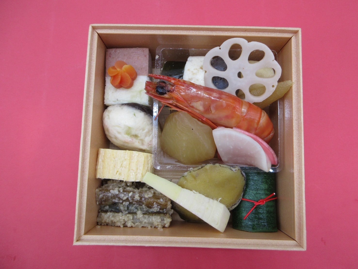 車海老艶煮・敦賀産黒あわび酒蒸し・叩き牛蒡・数の子・巻き湯葉・花蓮根・裏白しいたけ・紅白かまぼこ・蕗信田巻き・玉蒟蒻・助子昆布巻き・国産たけのこ・笹巻小倉胡麻豆腐・栗蜜煮・紅白蕪酢漬け・黒毛和牛A5サーロイン・アブラボウズ西京焼き・敦賀産大鰆幽庵焼き・黒豆・田作り・合鴨ロース・サーモン変わり鮨・芋きんとん・胡桃とレーズンの松風・練り切り・自家製醤油いくら・玉子焼き・梅人参・金柑蜜煮